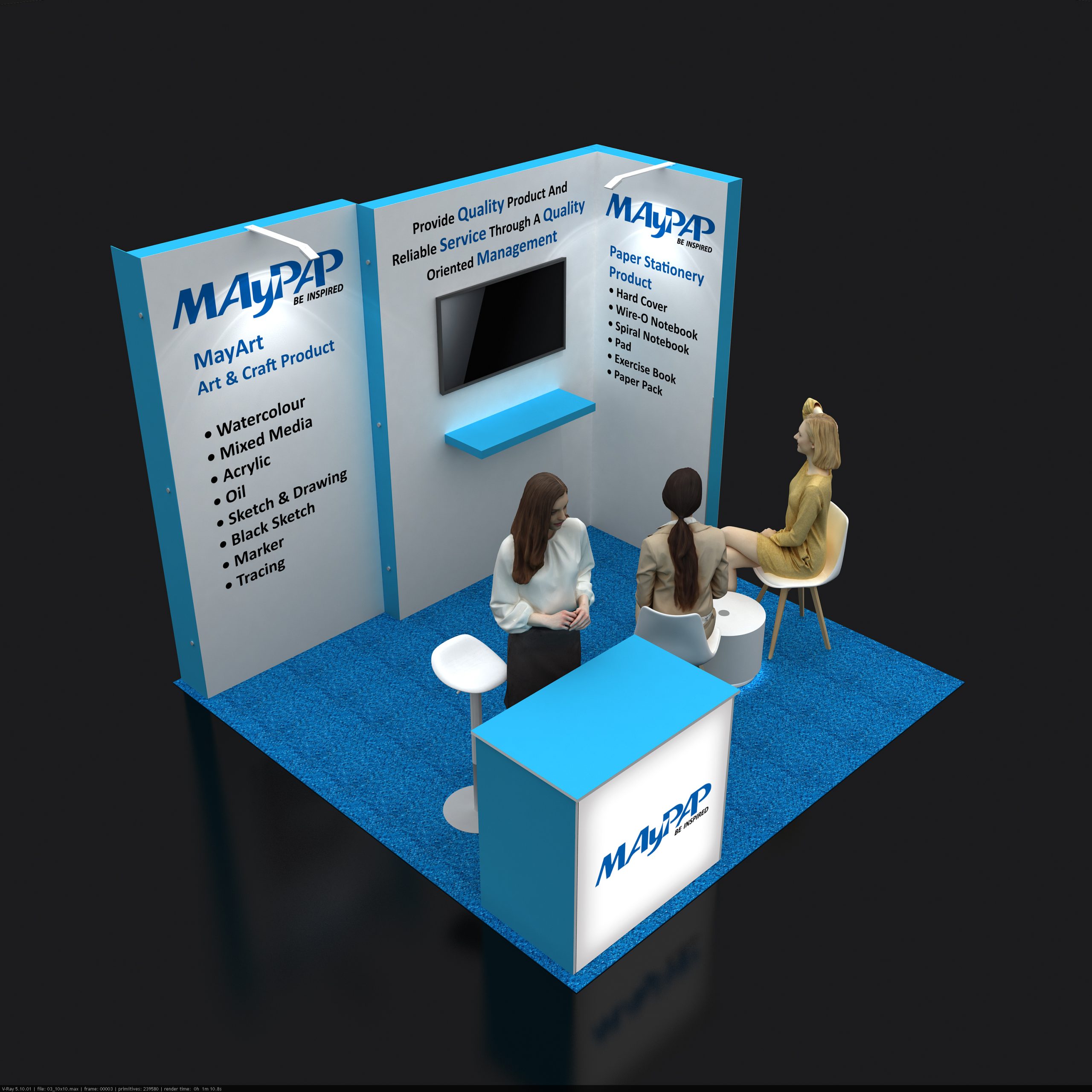 - We add 3D logos, backlit walls, touchscreen displays, and more to your 10×10 trade show display for deeper engagement.