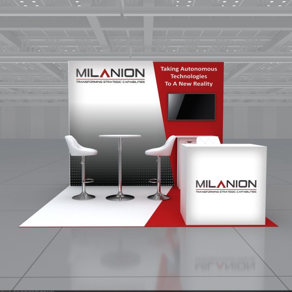 A stylish 10×10 trade show booth by Whimsical Exhibits, featuring custom graphics, seating, storage, TV screen, illuminated counter, turnkey delivery, and seamless project management.
