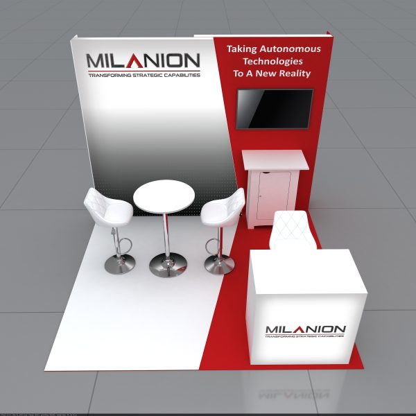 A stylish 10×10 trade show booth by Whimsical Exhibits, featuring custom graphics, seating, storage, TV screen, illuminated counter, turnkey delivery, and seamless project management.