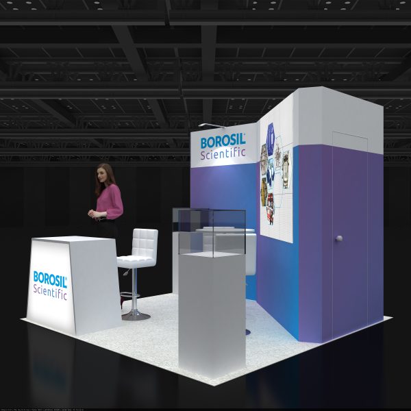 A modern 10×10 booth with dynamic video wall, secure display pedestals, sleek branding, turnkey services, and complete hassle-free project delivery.