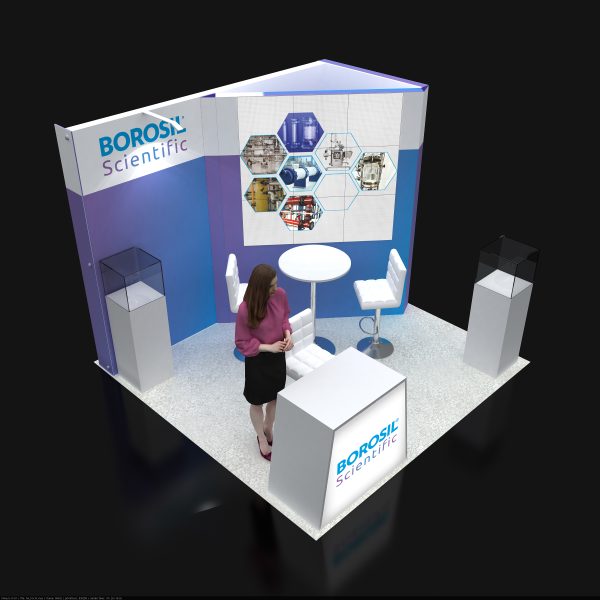 A modern 10×10 booth with dynamic video wall, secure display pedestals, sleek branding, turnkey services, and complete hassle-free project delivery.