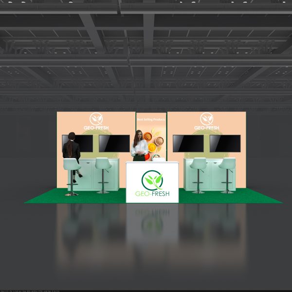 A 10×20 trade show booth featuring dual demo counters, four monitors, central reception, private seating, full graphics, lighting, and turnkey convenience.