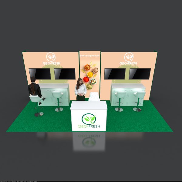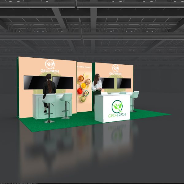 A 10×20 trade show booth featuring dual demo counters, four monitors, central reception, private seating, full graphics, lighting, and turnkey convenience.