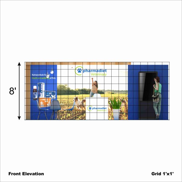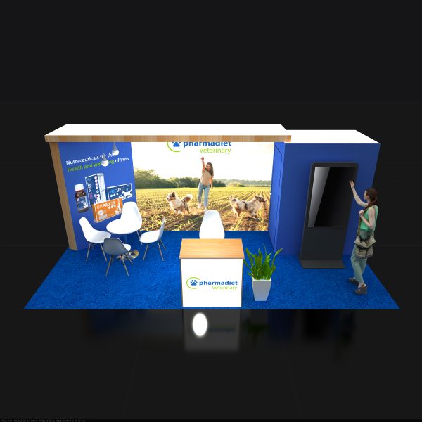 Bright yellow 10×20 booth with illuminated reception, meeting area, digital kiosk, wood accents, and plant for welcoming, modern presence