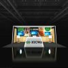 Premium 10×20 booth in black, white, and wood with illuminated canopy frame, back-wall graphics and screens, built-in storage counters, central round meeting table, barstools, and branded front reception counter.