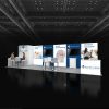 A 10×30 trade show booth featuring triple branded panels, dual seating zones, a central reception counter, an ethics-themed word cloud, lab-inspired visuals, full wall graphics, ambient lighting, and a modern corporate showcase.