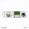 Minimal 10×30 booth in blue, white, and wood with overhead canopy, central grass backdrop reception, side fabric graphic panels, two bar-height meeting zones with stools, and semi-enclosed timber partitions for privacy.