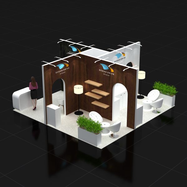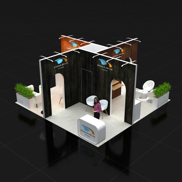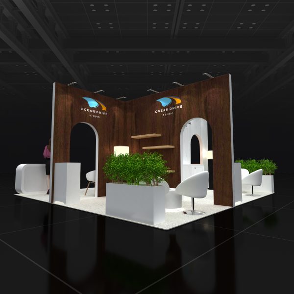 This Ocean Drive Studio’s 20×20 booth features arched wood-textured walls, white lounge seating, lush planters, branded reception, and ambient lighting that creates a sleek & inviting space for networking and engagement.