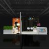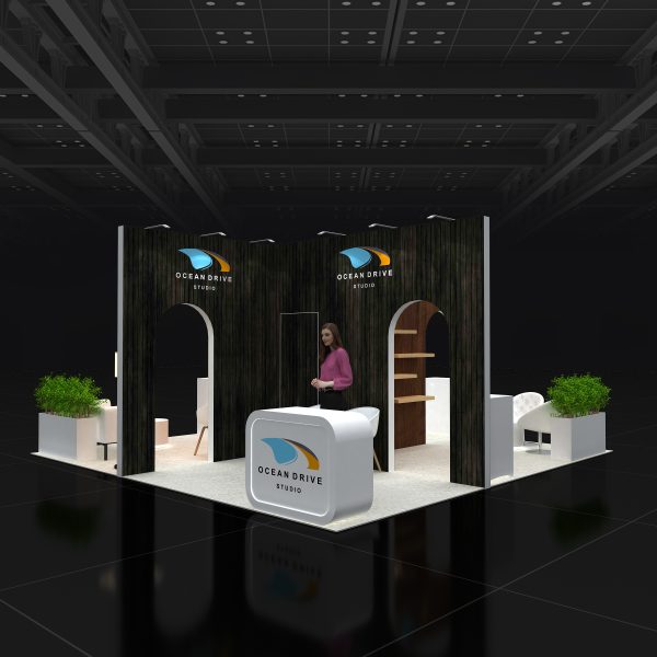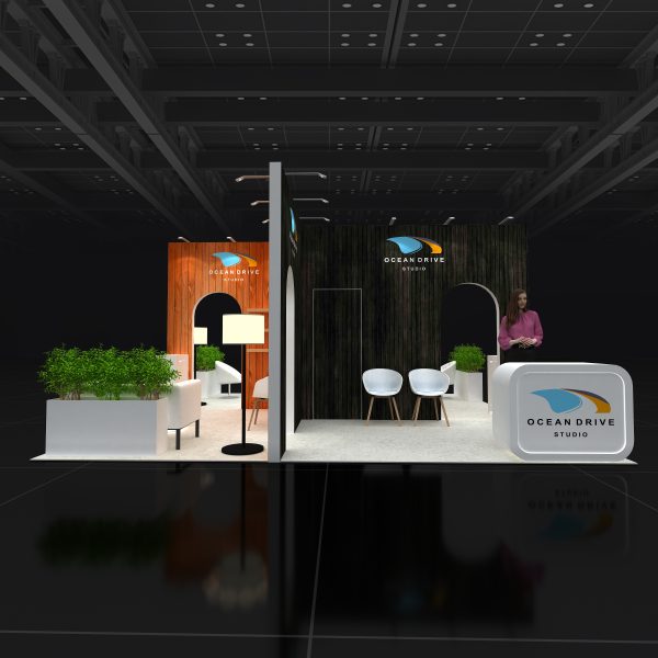 This Ocean Drive Studio’s 20×20 booth features arched wood-textured walls, white lounge seating, lush planters, branded reception, and ambient lighting that creates a sleek & inviting space for networking and engagement.