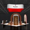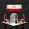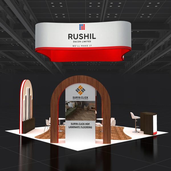 Elegant 20×20 booth in white, red, and wood tones with overhead sculpted banner, twin arched product portals, central reception counter, wood inlay flooring, cafe seating, and premium lounge chairs for meetings.