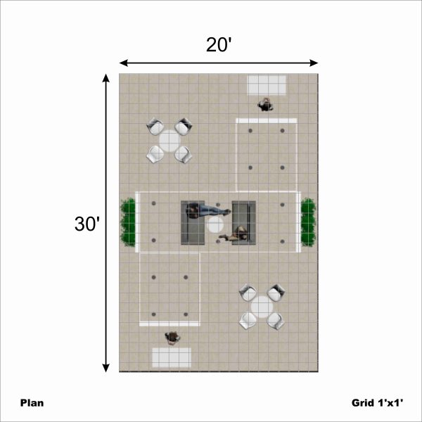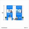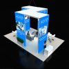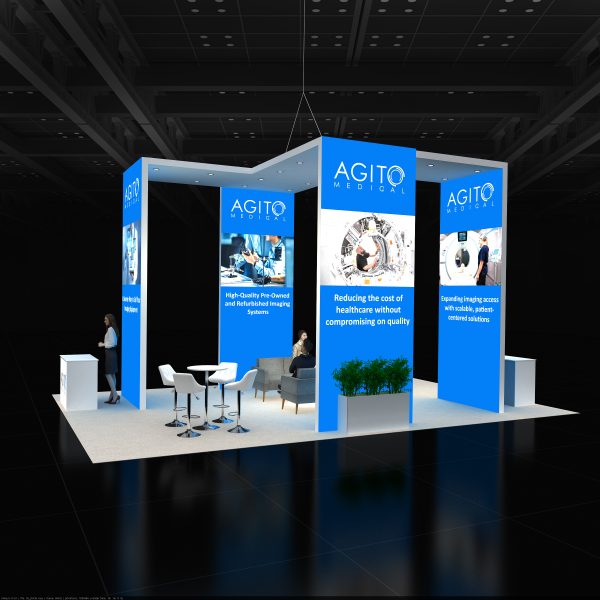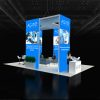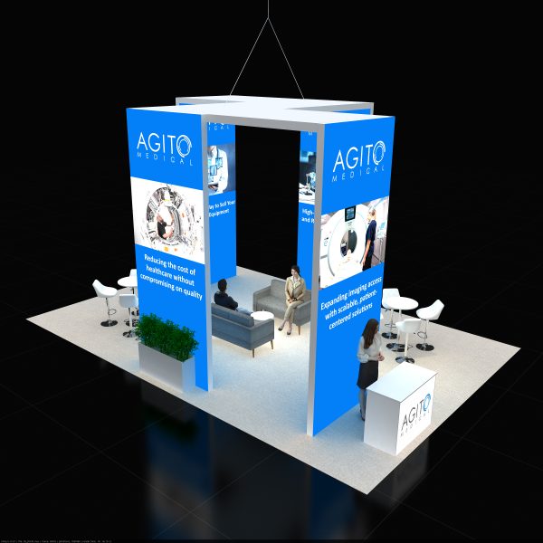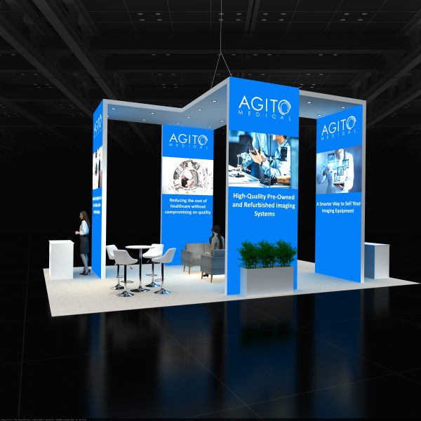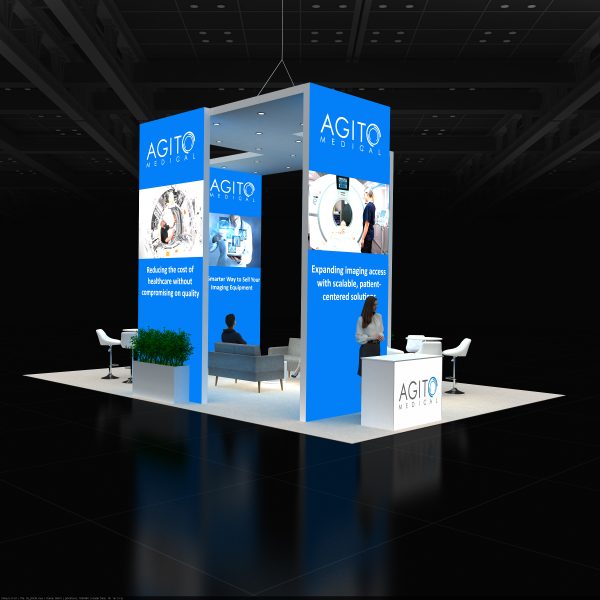 A refined 20×30 booth with dual vertical brand pillars, open lounge seating, bar-height meeting stations, and a sleek reception counter, which is framed by mission-driven messaging and a clean blue-white palette for a trusted presence