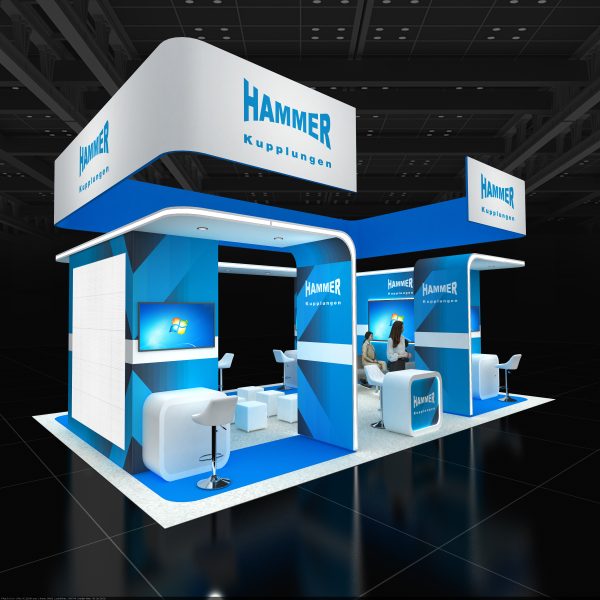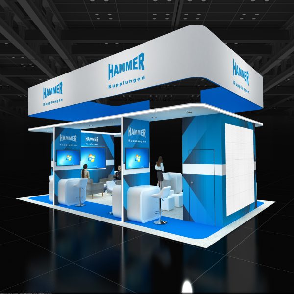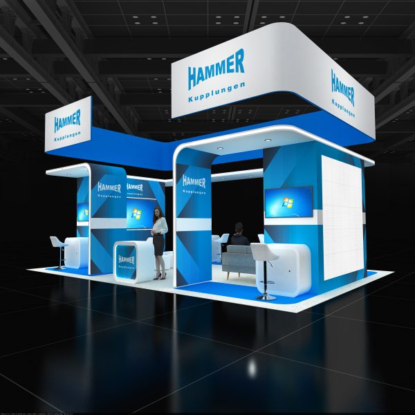 Sleek 20×30 booth in blue and white with overhead banner, wraparound canopy, graphic feature walls, multiple screen demo counters, lounge seating with sofas and cubes, barstools, and open reception area.