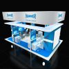 Sleek 20×30 booth in blue and white with overhead banner, wraparound canopy, graphic feature walls, multiple screen demo counters, lounge seating with sofas and cubes, barstools, and open reception area.
