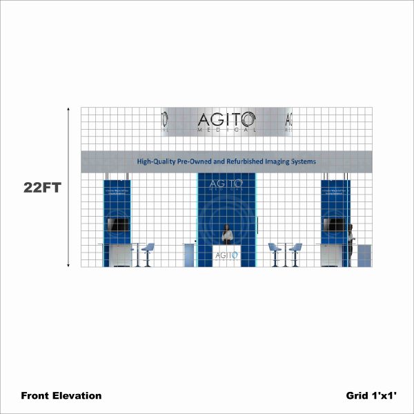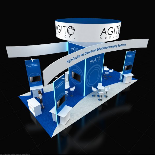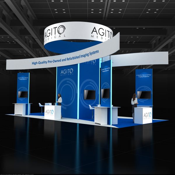 An eye-catching 20×40 booth with curved overhead signs, bilingual branding, several demo stations, special meeting spaces, and contemporary counters, made for powerful technology demonstrations and captivating customer interactions