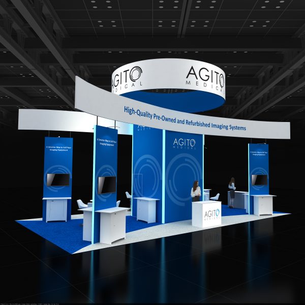 An eye-catching 20×40 booth with curved overhead signs, bilingual branding, several demo stations, special meeting spaces, and contemporary counters, made for powerful technology demonstrations and captivating customer interactions