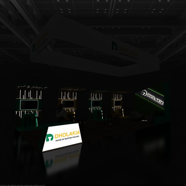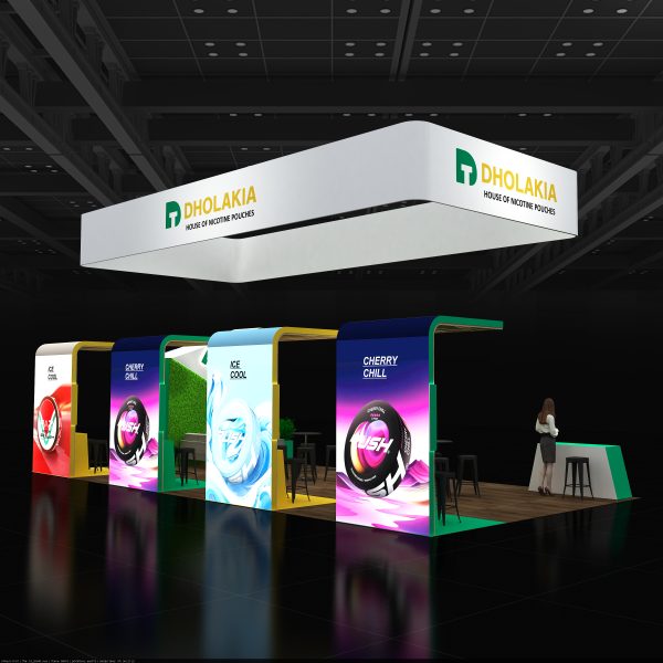 Vibrant 20×40 booth with wood flooring, bold green-yellow demo pods featuring TVs and bar stools, overhead branding fascia, reception counter, central networking tables, and cozy lounge with green wall and planters.