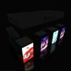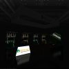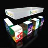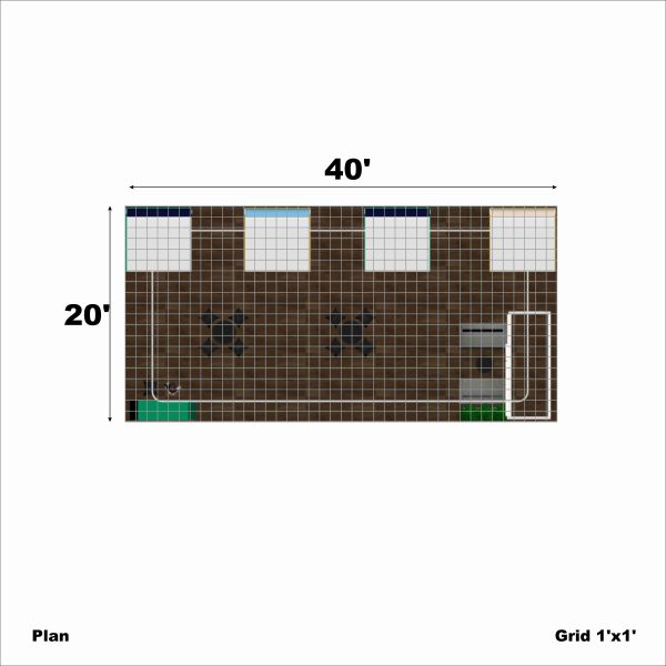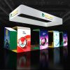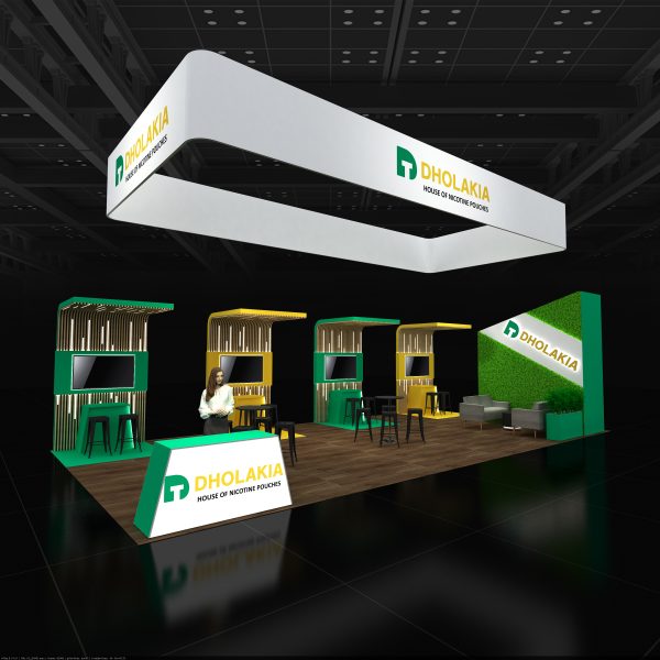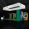 Vibrant 20×40 booth with wood flooring, bold green-yellow demo pods featuring TVs and bar stools, overhead branding fascia, reception counter, central networking tables, and cozy lounge with green wall and planters.