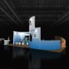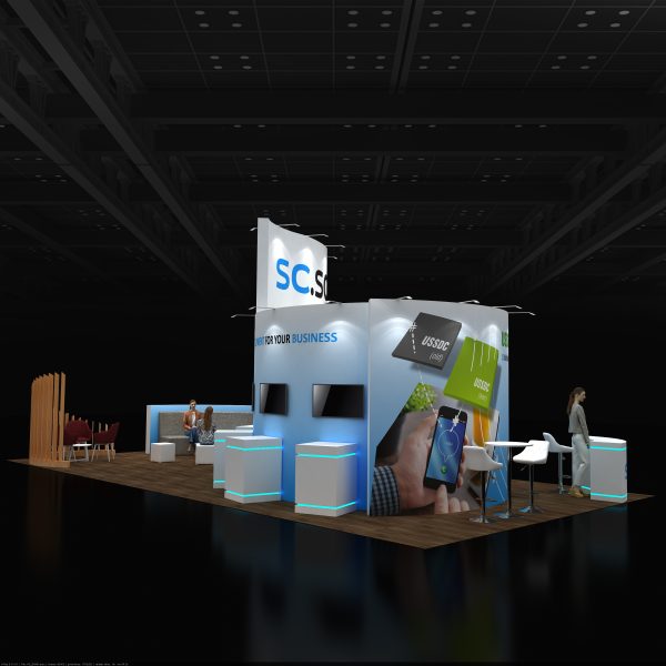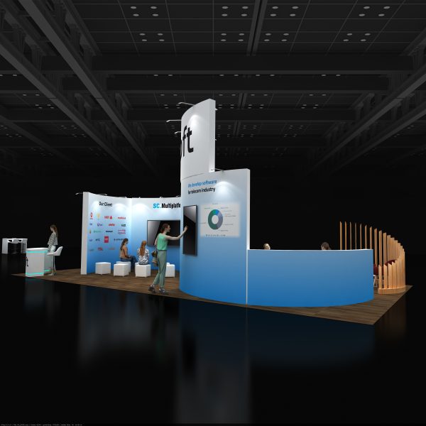 Contemporary 20×40 booth with dark wood floor, white and blue curved graphic walls, overhead branding banner, multiple screen demo stations, cube seating theatre, semi-enclosed wooden lounge pod, and casual meeting tables.