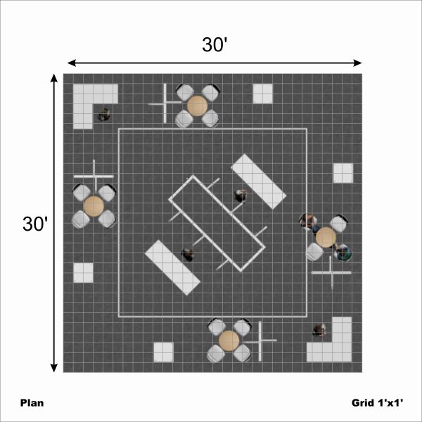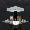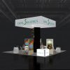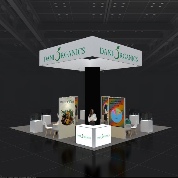 A lively 30×30 booth with eye-catching spice imagery, a central reception counter, circular product charts, and immersive branding that is ideal for product showcases and customer interaction.